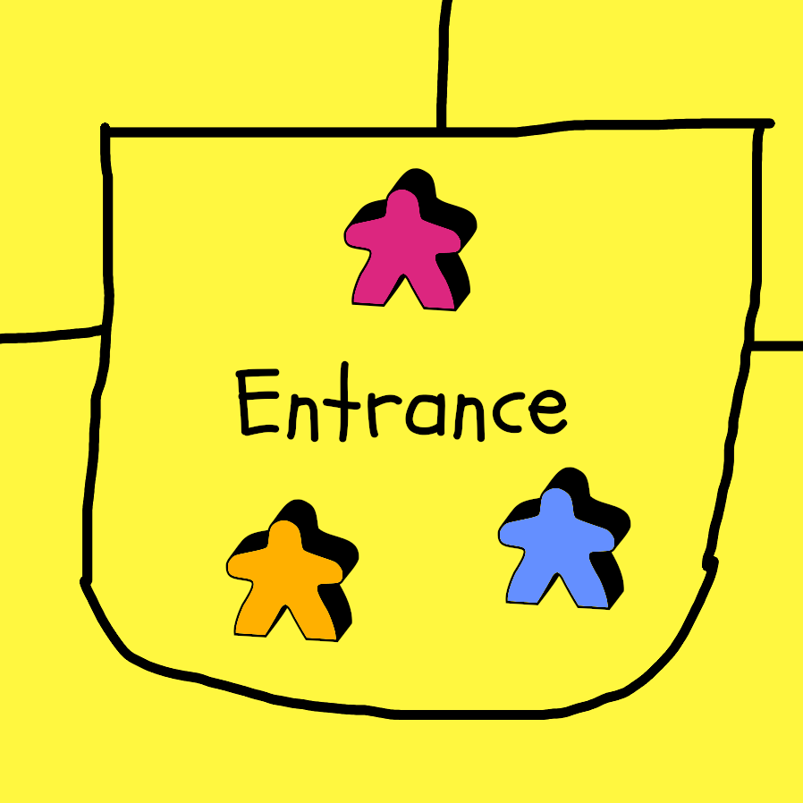 Below, Adam and Axel use the exit on the left. The facilitator has a pool of 6 locations (not including the entrance) so they roll a D6 to randomly decide which location they move to.