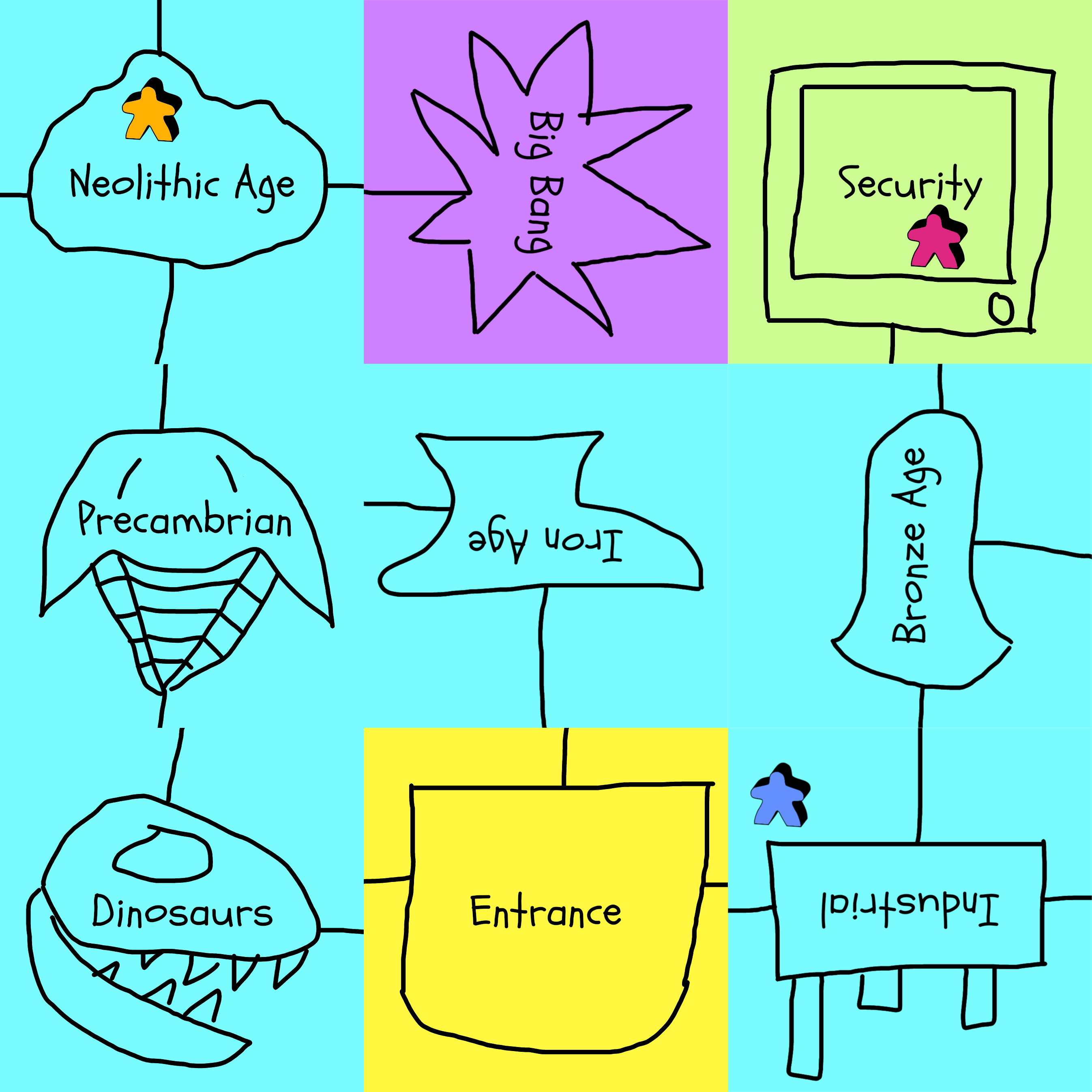 For one last example, Axel decides to use the top exit in the Dinosaurs exhibit. The facilitator rolls a 2, the Dinosaurs exhibit. Since the Dinosaurs exhibit is already in play the facilitator puts down the Precambrian exhibit instead (location 1).